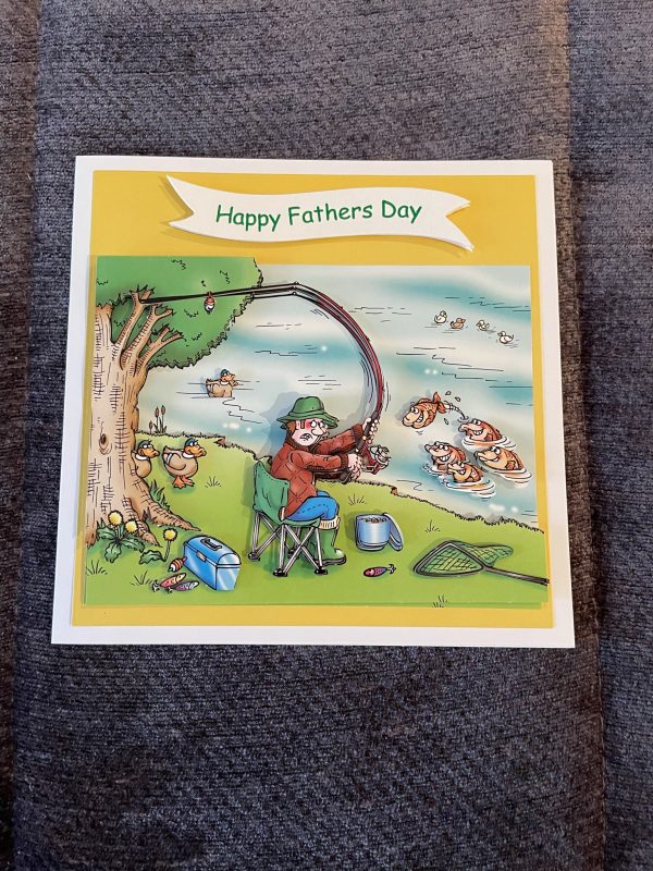 3D Handcrafted “Fishing” themed card. Can be suitable for Birthday’s or Father’s day. Sentiments ‘Happy Birthday’ and ‘Happy Father’s Day’ banner’s are white with red, blue or green writing.